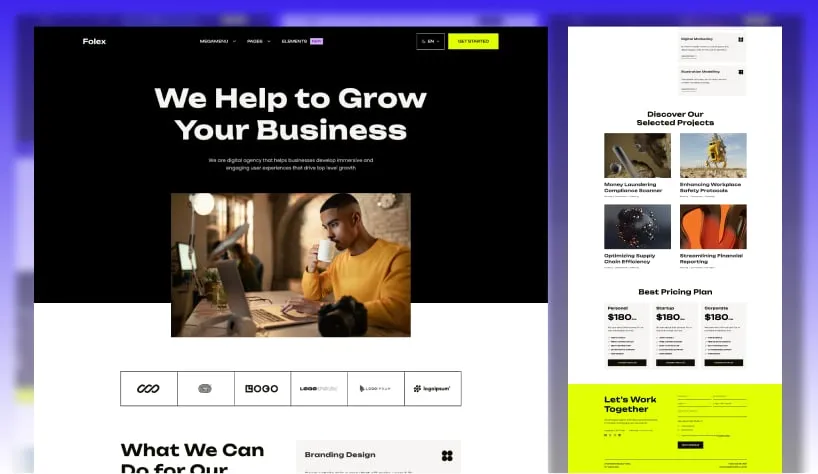 For advanced animations, blog system, portfolio layouts, and a full suite of pre-built pages, check out the Folex Pro version.